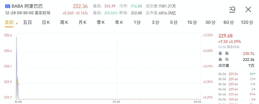 华盛资讯12月29日讯,阿里巴巴(BABA)盘前涨3.29%,阿里港股今日反弹收涨5.71%。
