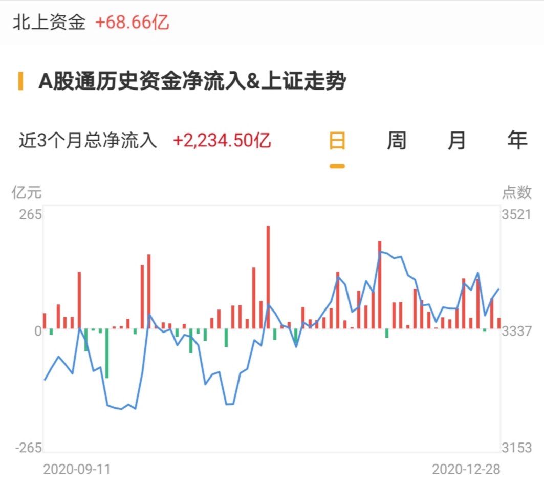 北上资金今日净流入68.66亿元,流入规模大幅增加近46亿元。