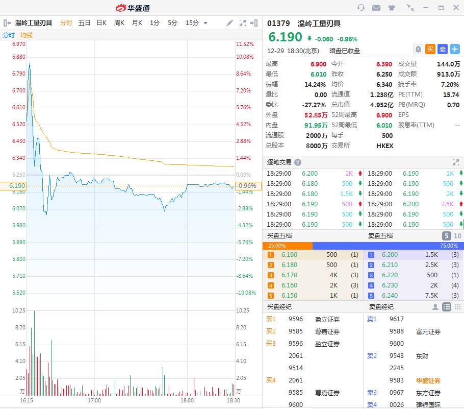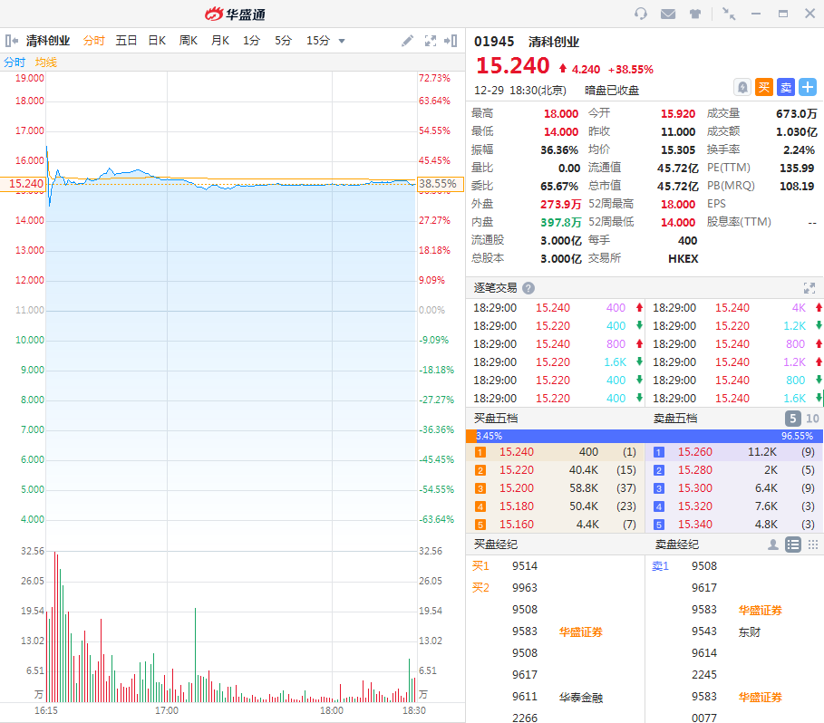 华盛资讯12月29日讯,截至收盘:清科创业(01945.HK)暗盘收盘报价15.24港元,较发行价11.0港元涨幅为38.55%,一手账面盈利1696港元。最新成交额1.03亿港元,总市值为45.72亿港元;温岭工量刃具(01379.HK)暗盘收盘报价6.19港元,较发行价6.25港元跌幅为0.96%,一手账面亏损30港元。最新成交额913万港元,总市值为4.952亿港元,两股都将于明日正式上市。