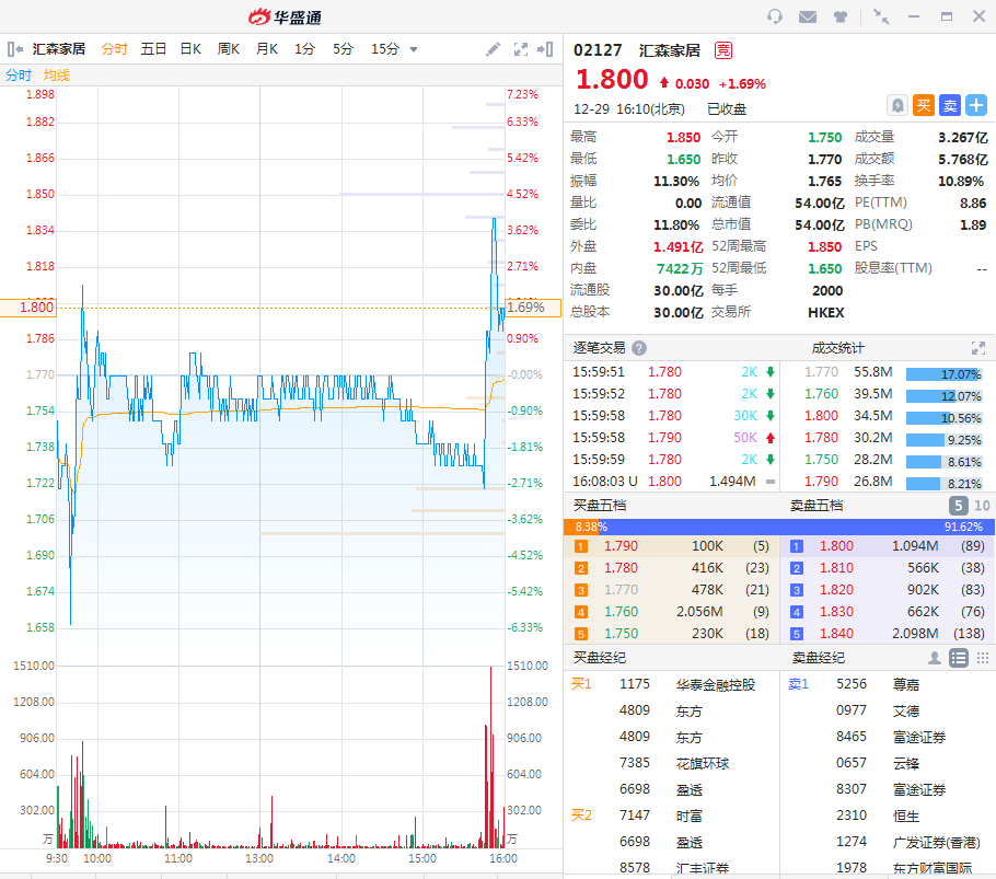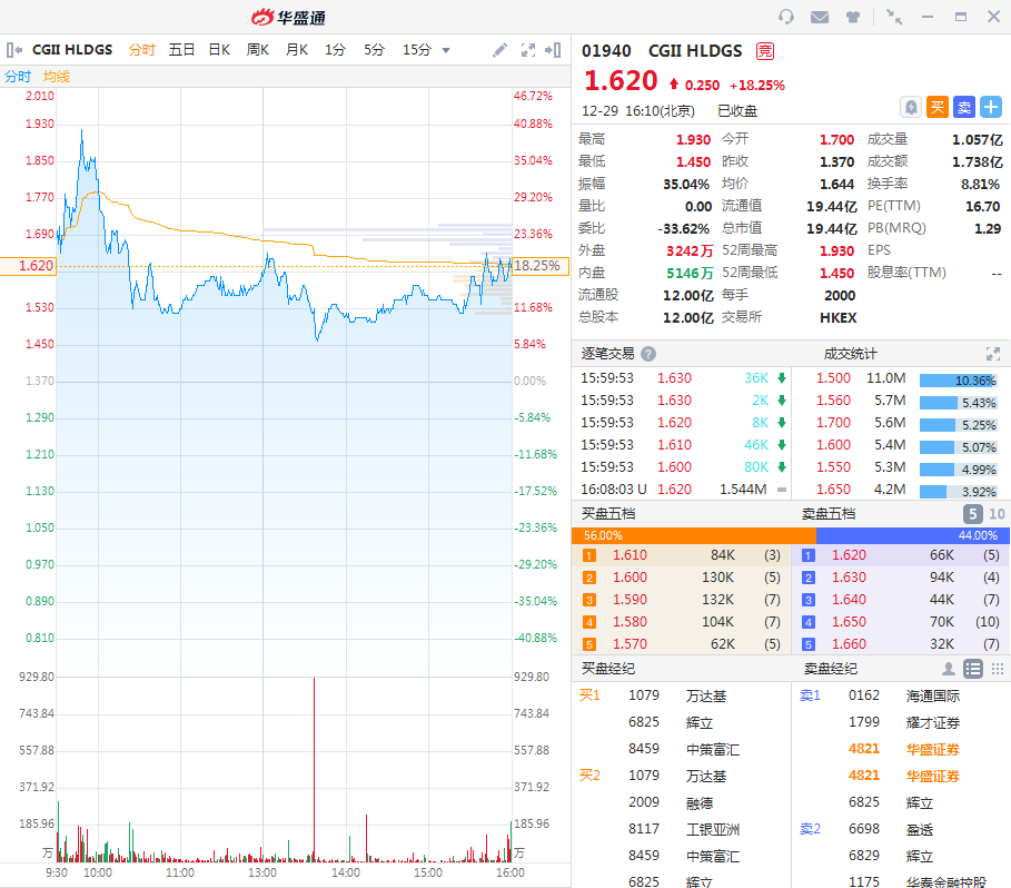 华盛资讯12月29日讯,两股今日首挂,截至收盘:CGII HLDGS(01940.HK)收涨18.25%,报价1.62港元,全日最高价1.93港元,最低价1.45港元,最新总市值19.44亿港元,成交额1.738亿港元,一手盈利500港元;汇森家居(02127.HK)收涨1.69%,报价1.80港元,全日最高价1.85港元,最低价1.65港元,最新总市值54.0亿港元,成交额5.768亿港元,一手盈利60港元。