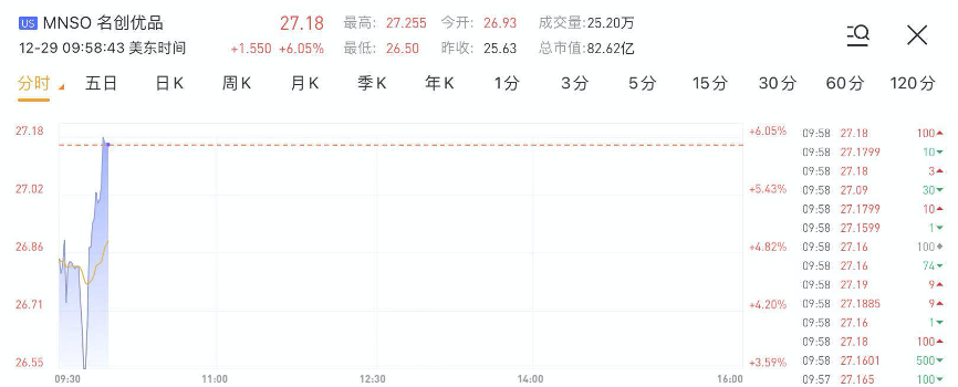 华盛资讯12月29日讯,继昨日大跌超17%后,名创优品今日开盘反弹超6%。截至发稿,名创优品涨6.05%,现报27.18美元,当前总市值82.62亿美元。