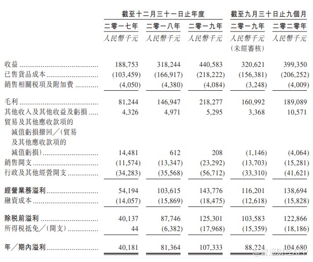 招股书显示,截止2017年至2019年度及截止2020年9月30止九个月,环球新材收入分别为1.89亿元、3.18亿元、4.41亿元及3.99亿元;毛利分别为8124.4万元、1.47亿元、2.18亿元及1.89亿元,毛利率分别为43%、46.2%、49.5%及47.3%;净利分别为4018.1万元、8136.4万元、1.07亿元及1.05亿元,净利率分别为21.3%、25.6%、24.4%及26.2%。