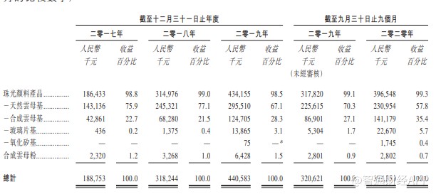 其中,天然云母基为公司主要收入来源,截止2017年至2019年度及截止2020年9月30止九个月,天然云母基收入占总收入的75.9%、77.1%、67.1%及57.8%;合成云母基占总收入的22.7%、21.5%、28.3%及35.4%。