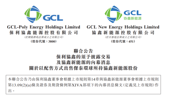 保利协鑫能源和协鑫新能源联合公告,杰泰环球(保利协鑫的全资附属公司),作为卖方与联席配售代理订立配售协议,据此,卖方同意出售及联席配售代理同意(作为其代理人)按尽力基准,在配售协议条款及条件的规限下,促使承配人购买卖方所持最多638,298,000股配售股份,配售价为每股配售股份0.235港元,较12月29日收市价折让约32.86%。配售完成后,保利协鑫能源持股协鑫新能源股份从62.28%减少为58.94%。