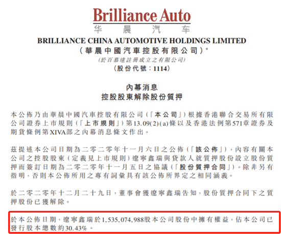 12月30日消息,华晨中国(01114.HK)公布,于2020年12月29日,董事会获辽宁鑫瑞告知,股份质押合同下的质押股份已获解除。于本公布日期,辽宁鑫瑞于15.35亿股公司股份中拥有权益,占公司已发行股本总数约30.43%。