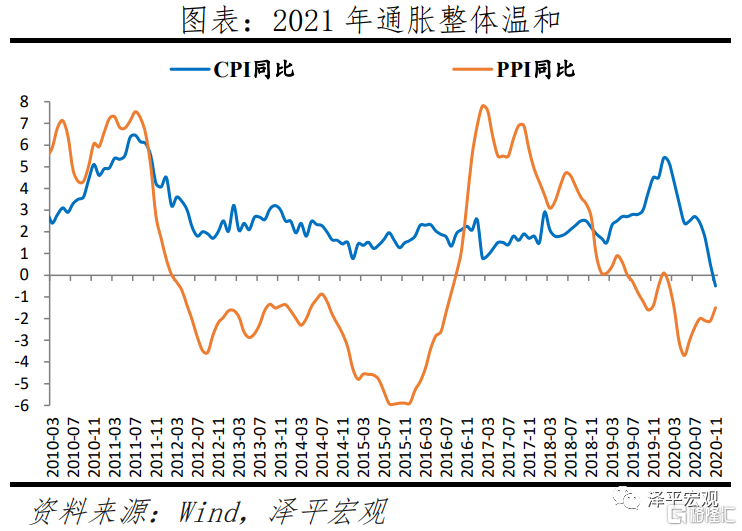 通胀整体温和。当前是猪周期下行叠加经济周期上行,猪周期下行抑制CPI上涨,经济周期上行推动PPI环比正增长。从趋势看,PPI恢复好于核心CPI,印证疫后中国经济恢复工业生产好于终端需求。预计2021年伴随经济恢复,物价温和上涨,经济基本面和货币环境不足以支撑通胀大幅上涨。
