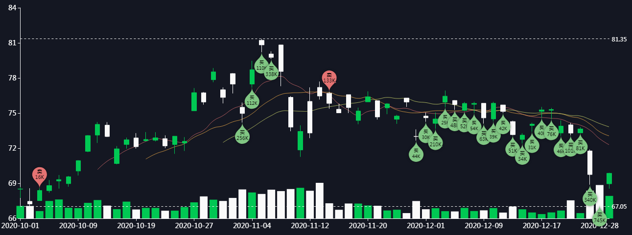 其中,近3个月ARK对腾讯ADR的买卖轨迹如下图: