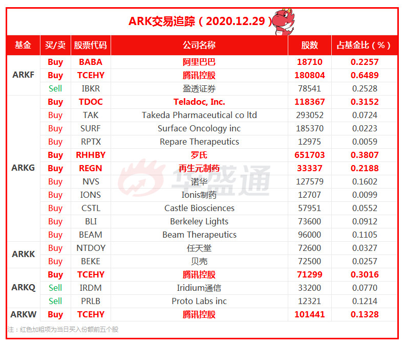 4.腾讯ADR、Teladoc、罗氏、阿里巴巴和再生元制药为当日买入份额最多的五只个股