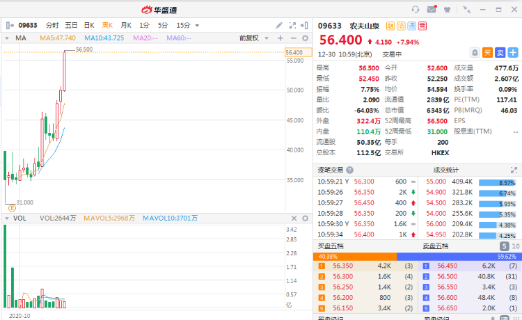 12月30日消息,农夫山泉涨7.94%,现报56.4港元,最新市值6345亿港元。