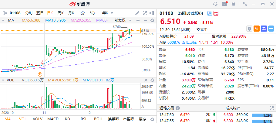 华盛资讯12月30日消息,由于供应紧张,光伏玻璃的利润急增,预计光伏玻璃的平均售价将保持在创纪录的每平方米35元至40元人民币。玻璃双雄午后再度走强,截至发稿,洛阳玻璃股份涨5.51%,现报6.51港元每股,A股拉升至涨停;福莱特玻璃涨5.47%,现报30.85港元每股,总市值突破600亿。
