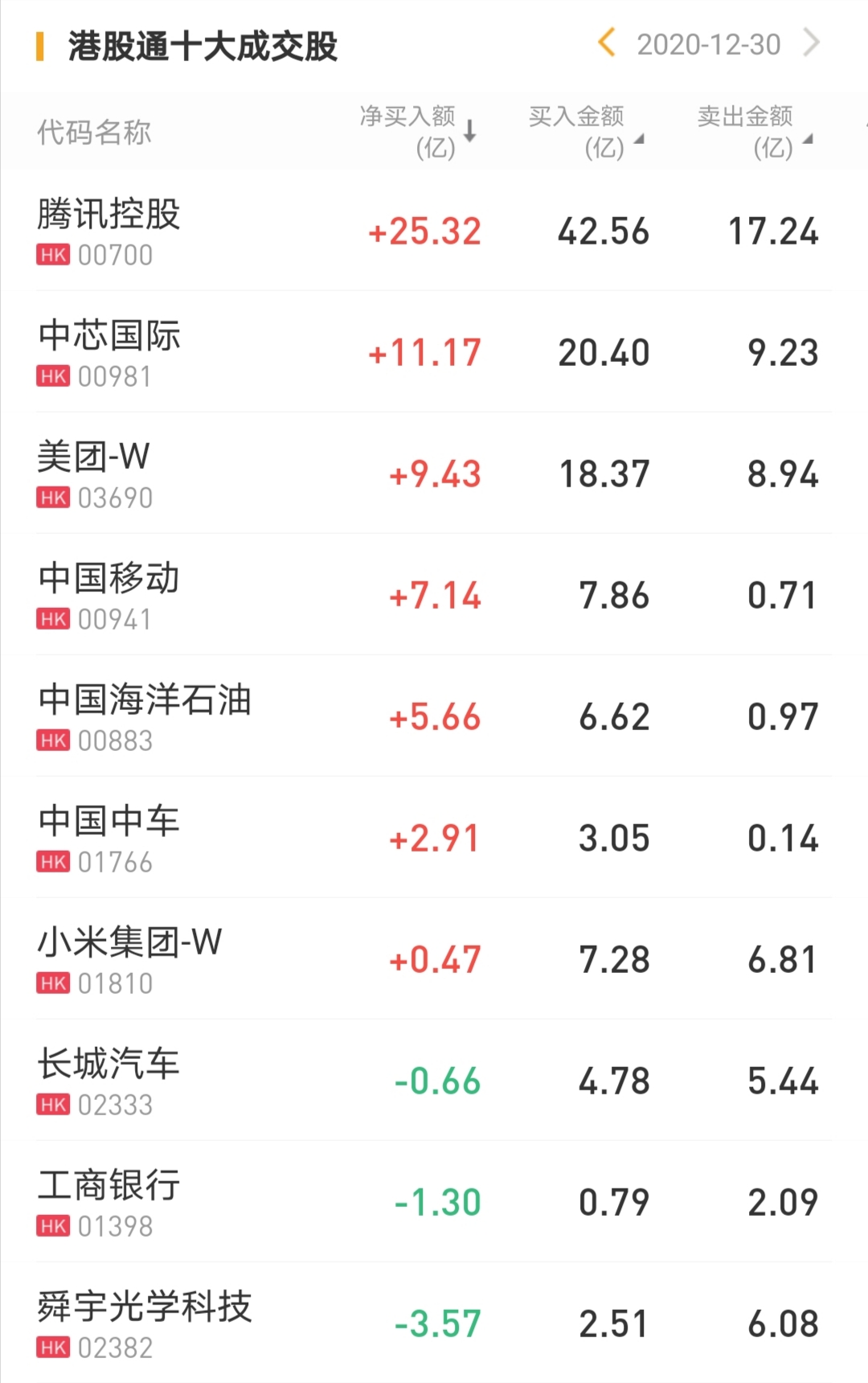 个股方面,今日南下资金继续净买入腾讯控股25.32亿港元,为今日买入之最。此外,南下资金净买入中芯国际11.17亿港元,净买入美团9.43亿港元。