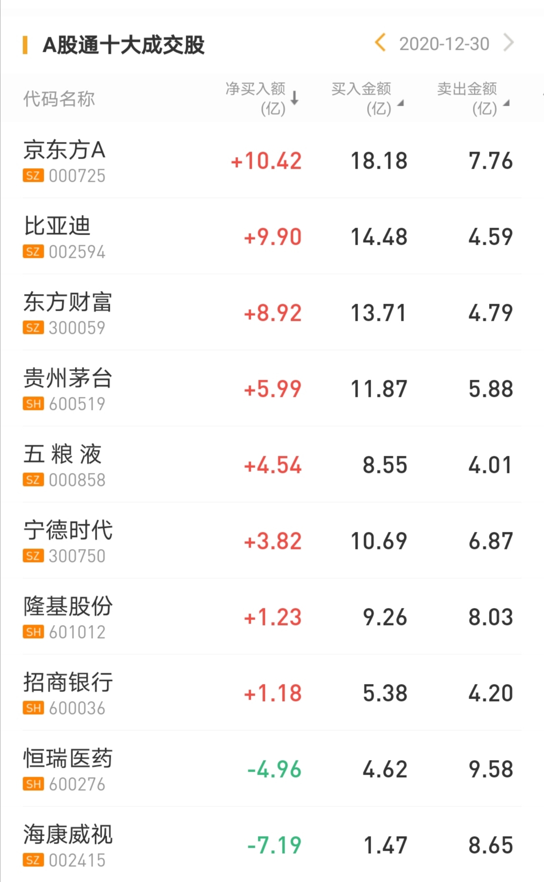 北上资金今日净买入京东方A 10.42亿元,为今日买入之最。此外,北上资金今日净买入比亚迪9.9亿元,净买入东方财富8.92亿元。