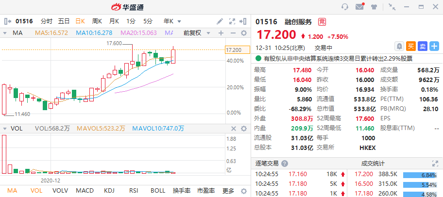 华盛资讯12月31日消息,物业次新股融创服务(01516)盘中异动,股价大涨逾7%,逼近历史新高。截至发稿,融创服务涨7.5%%,现报17.2港元每股,当前成交额9622万港元,总市值533.8亿港元。较发行价11.6港元已涨近50%。