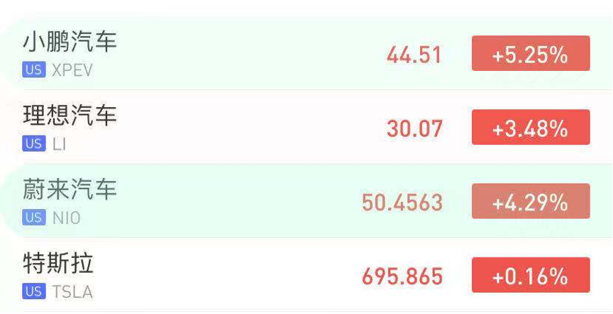 华盛资讯12月31日讯,新能源汽车全线大涨,小鹏汽车涨超5%!截至发稿,小鹏汽车涨5.25%,蔚来汽车涨4.29%,理想汽车涨3.48%,特斯拉涨0.16%。