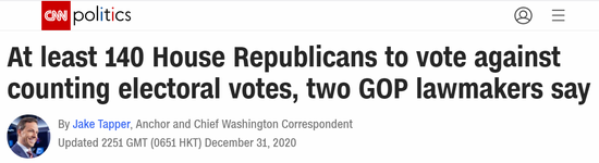 【环球时报-环球网记者 邵一佳】据美国有线电视新闻网(CNN)报道,两名共和党众议员在2020年最后一天透露,预计众议院中至少有140名共和党人将在1月6日反对清点选举人票,试图推翻美国大选结果,为特朗普发起最后的挣扎。