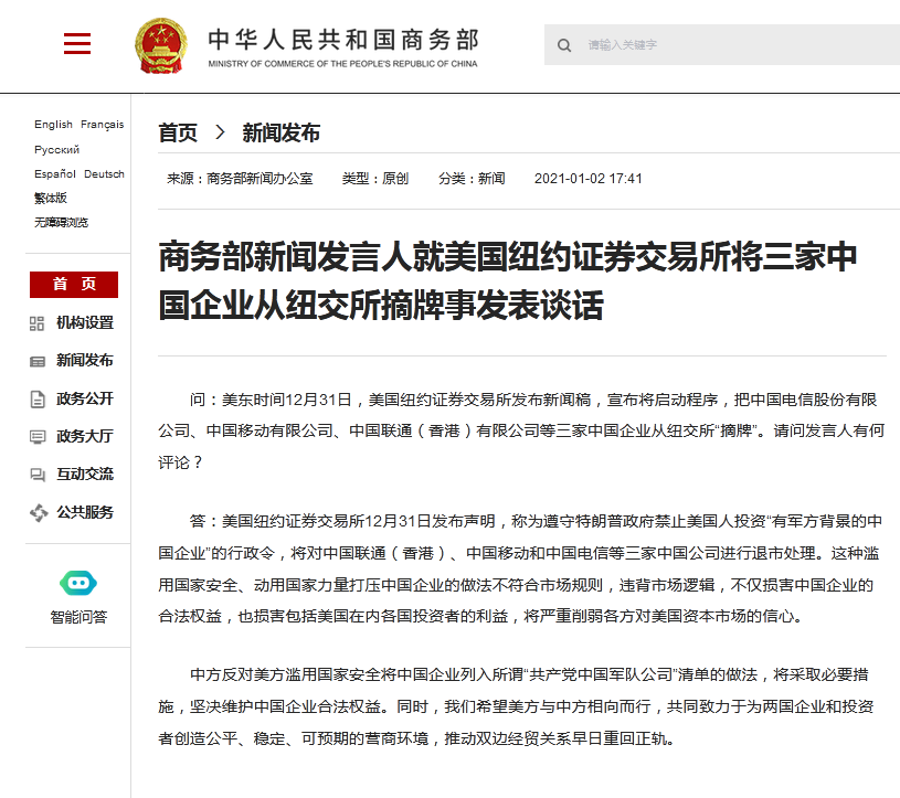 问:美东时间12月31日,美国纽约证券交易所发布新闻稿,宣布将启动程序,把中国电信股份有限公司、中国移动有限公司、中国联通(香港)有限公司等三家中国企业从纽交所“摘牌”。请问发言人有何评论?