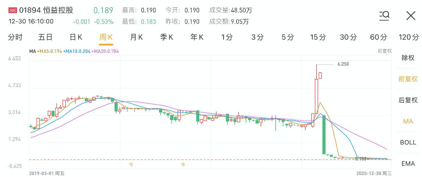 然而,随后经历的“三段式”暴跌让该股现出原形:19年12月16日跌超55%,20年1月14日跌超67%,3月30日再度跌超77%!从10.2港元暴跌至不足2毛钱,而且还是一一波三折的方式,仿佛“一字断魂刀”重现港股!