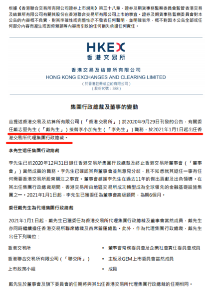 公告称,依照香港交易所于2020年9月29日刊发的公告,有关委任戴志坚先生接替李小加先生职务,于2021年1月1日起出任香港交易所代理集团行政总裁。