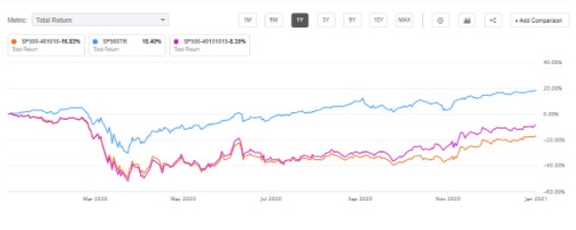 可以肯定的是,银行投资者可能急于告别2020年。标普银行精选行业指数今年累计下跌了17%(橙色线见下图),而覆盖面更广的标准普尔500指数上涨了18%(蓝色线)。区域性银行指数(紫色)的跌幅相对较小,全年下跌了8%。