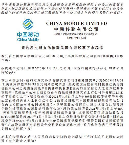 三大运营商集体公告:尚未收到纽交所将公司美国存托股票下市的通知