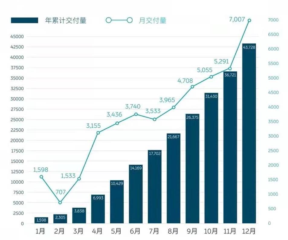 蔚来公布2020年全年交付总量达43728台,同比增长112.6%,其中,12月共交付新车7007台,环比增长32.4%,连续第五个月创品牌单月交付数新高;同比增长121.0%,自今年4月以来连续第九个月实现同比翻番。