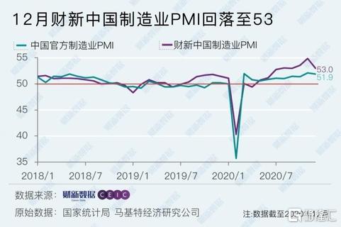 1月4日公布的2020年12月财新中国制造业PMI(采购经理指数)录得53,虽较11月的十年来高点下降1.9个百分点,但仍显著高于荣枯线,显示疫情后经济恢复仍在持续。