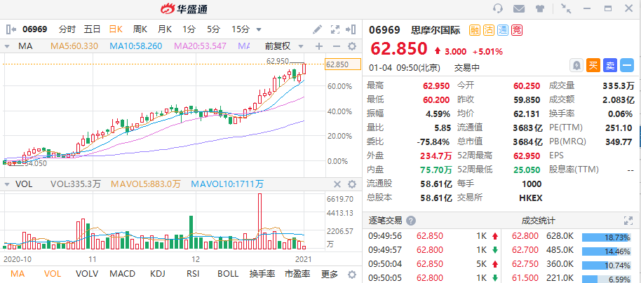 华盛资讯1月4日讯,思摩尔国际(06969)早盘高开高走,盘中股价再创历史新高,最高见,62.95港元。截至发稿,思摩尔涨5.01%,现报62.85港元,成交额2.083亿港元,当前总市值为3684亿港元。