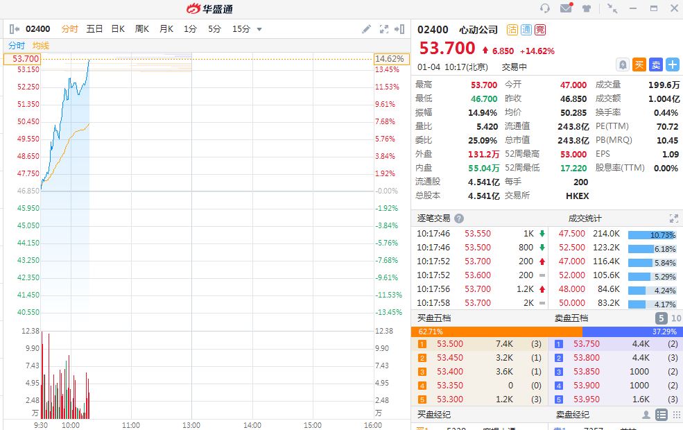 华盛资讯1月4日讯,心动公司早盘高开高走,盘中股价再创历史新高,最高见53.7港元。截至发稿,心动公司涨14.62%,现报52.7港元,成交额1.004亿港元,当前总市值为243.8亿港元,近5日累计涨超25%。