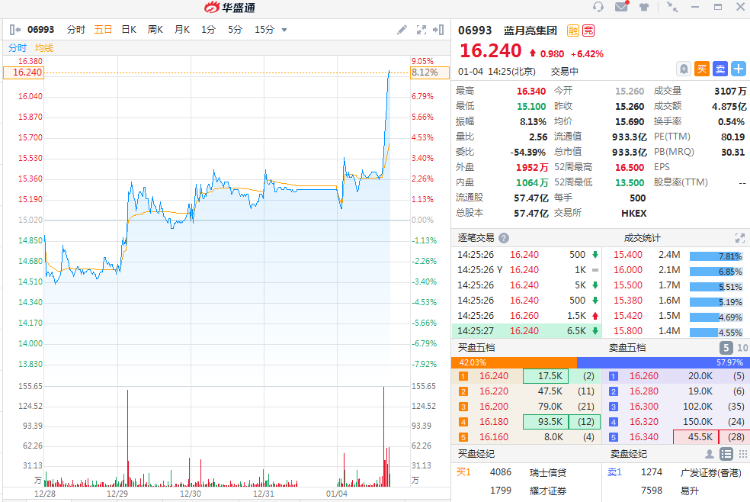 1月4日消息,蓝月亮集团短线走高,现涨6.42%,报16.24港元,最新市值933.3亿港元。此前华创证券予蓝月亮推荐评级及目标价17.31港元,称蓝月亮将受益于品类扩张与渠道下沉。