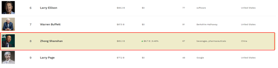 福布斯实时富豪榜显示,农夫山泉创始人钟睒睒以853亿美元身家跻身全球富豪榜第八位,超越谷歌创始人拉里·佩奇,排名第七位的是沃伦·巴菲特。