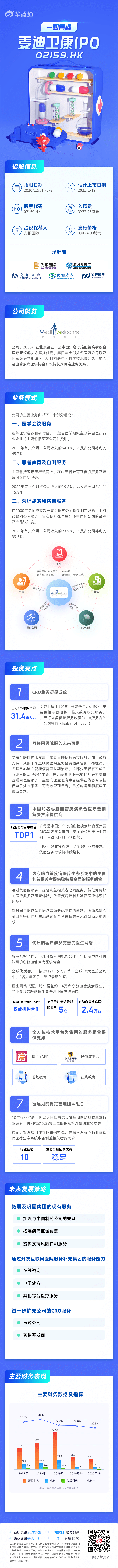 公司主要提供医学会议服务、患者教育及自测服务以及营销战略和咨询服务,目标为解决心脑血管疾病医疗生态系统各主要利益相关者(包括医生、患者、医药公司、医学组织及医院)的未满足需求,并弥合该等利益相关者之间的距离。除了提供综合医疗营销解决方案外,公司亦于2019年年底开始提CRO服务及互联网医院服务。以下能带你一图看懂麦迪卫康: