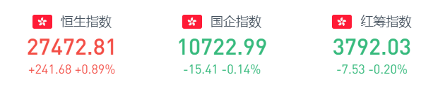 周一,恒生指数开盘跌0.53%,早盘随A股急速拉升。截至收盘,恒生指数涨241.68点或0.89%,报27472.81点,全日成交额达1807.95亿。国企指数跌0.14%,报10722.99点,红筹指数跌0.2%,报3792.03点。