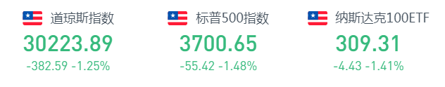 截至收盘,道琼斯指数跌382.59点,跌幅1.25%,报30223.89点;标普500指数跌54.33点,跌幅1.45%,报3701.74点;纳斯达克综合指数跌189.84点,跌幅1.47%,报12698.45点。