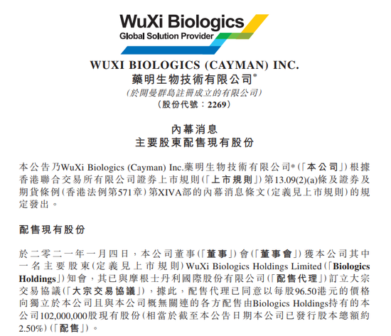 1月5日消息,药明生物:于二零二一年一月四日,本公司董事会获本公司其中一名主要股东WuXi Biologics Holdings Limited知会,其已与摩根士丹利国际股份有限公司订立大宗交易协议,据此,配售代理已同意以每股96.50港元的价格向独立于本公司且与本公司概无关连的各方配售由Biologics Holdings持有的本公司102,000,000股现有股份。