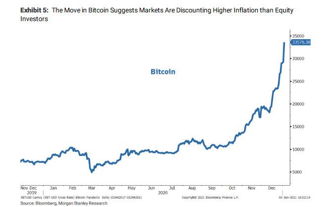 Wilson认为,2021年的一大意外可能是通胀率比包括美联储在内的很多人预期的高。当前的共识预期是,通胀价格会随着经济继续复苏而循序渐进地有序回升。但比特币等资产价格的波动预示,市场开始认为,通胀的调整可能不是那么渐进和有序的。