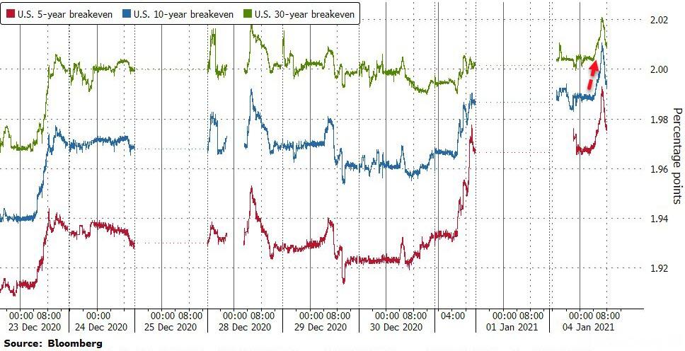 评论认为,财政刺激的力度加强也意味着,美联储保持超低利率货币刺激的压力减小,利率回升的可能性更高。这可以解释为何衡量市场对通胀预期的10年期美国平准通胀率本周一升破2%,为2018年以来首次突破2%关口。