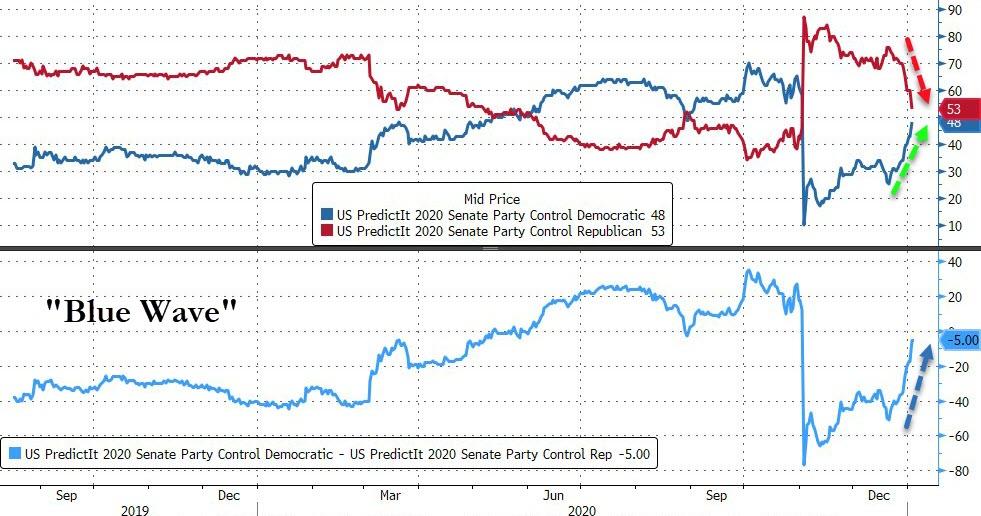 Predictit数据显示,最近几天,民主党人掌控参议院的几率明显上升,仅略低于50%。