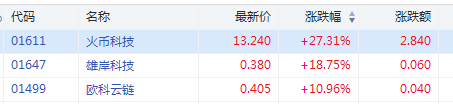1月5日消息,港股区块链板块持续走高,雄岸科技涨27.31%,火币科技涨18.75%,欧科云链涨10.96%。