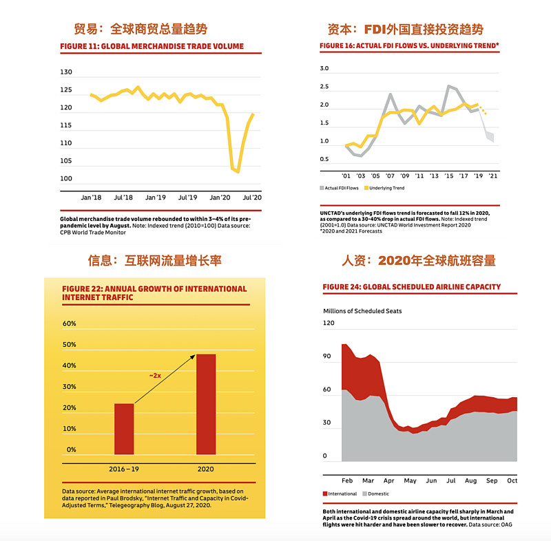 2020加速了这个过程。全球化这个风雨飘摇的小木屋里有四根柱子:贸易、资本、信息、人口,在封锁国境的2020以及将继续封锁国境的2021,除了信息以外,四根柱子折了三根。贸易总量下降,FDI停滞、国际航班不飞。只有互联网的信息流量,持续云上的繁荣(见下图)。