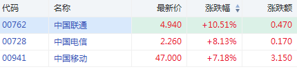 1月5日消息,港股电信股盘中直线拉升,中国联通涨10.51%,中国电信涨8.13%,中国移动涨7.18%。