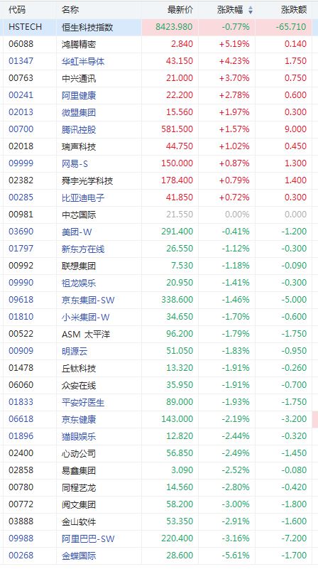 阿里巴巴跌超3%,金蝶国际跌超5%。
