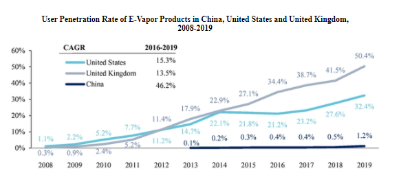 中国拥有全球最多的烟民数量,目前电子烟渗透率仅1.2%(美国 32.4%、英国50.4%),是最大的潜在市场。2019 年中国电子烟市场规模达到了15亿美元(+66%、封闭式占比74.1%),预计到2023年将达到113 亿美元(国内渗透率提升至 4%),CAGR高达65.9%、且封闭式占比预计超过97%。