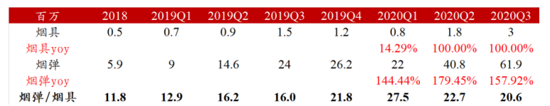 (2)雾化设备方面,悦刻一代(经典)、二代(阿尔法)、三代(灵点)、四代(无限)、五代(幻影)以及一次性电子烟小悦刻各有特色、构成了公司丰富的产品矩阵(新老款同时销售),满足了不同消费者的需求。消费者粘性增强体现在公司烟弹产品的复购率提升:19年烟具销量 430 万套、烟弹销量7380万颗,烟弹/烟具比例为17.16;20Q1-Q3烟具销量560万套、烟弹销量1.25亿颗(20Q3 单季度0.62亿颗),烟弹/烟具比例提高至22.27。