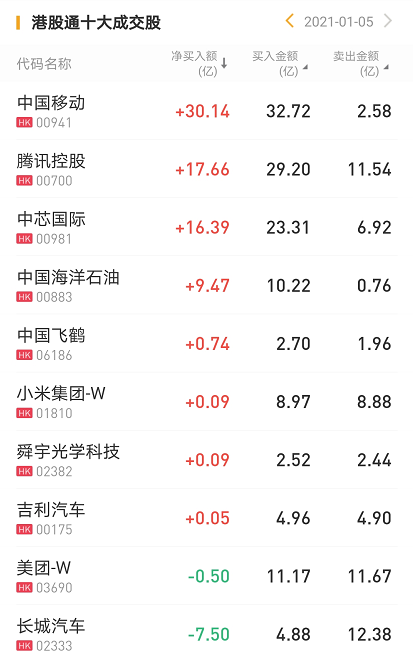 个股方面,今日南下资金继续净买入中国移动30.14亿港元,为今日买入之最。此外,南下资金净买入腾讯控股17.66亿港元,净买入中芯国际16.39亿港元。