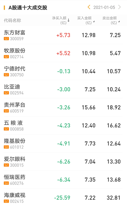 北上资金今日净买入东方财富5.73亿元,为今日买入之最。此外,北上资金今日净买入牧原股份5.52亿元。