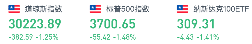 周一,在2021年首个交易日,道指及标普500指数早段再创新高,但不久高位掉头急泻,道指中段跌幅一度扩大至700点,全日低见29881.82点,挫穿3万点心理关口,中段三指指数跌幅均超2%。截至收盘,道琼斯指数跌382.59点,跌幅1.25%,报30223.89点;标普500指数跌54.33点,跌幅1.45%,报3701.74点;纳斯达克综合指数跌189.84点,跌幅1.47%,报12698.45点。