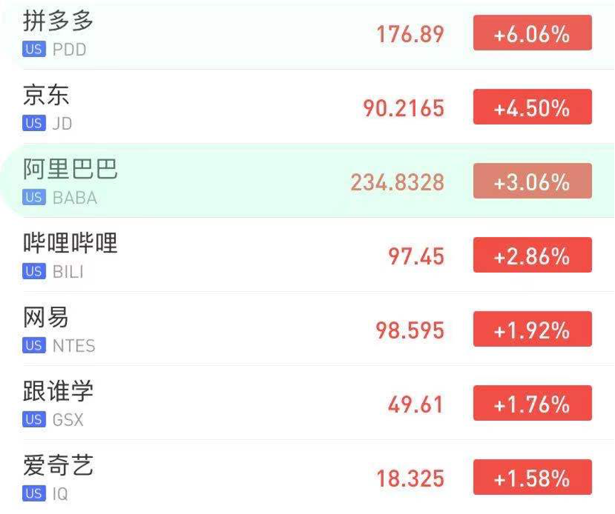 截至发稿,拼多多大涨6.06%,领涨中概;京东涨4.50%,阿里巴巴涨3.06%,哔哩哔哩涨近3%,网易、跟谁学、爱奇艺均涨超1%。