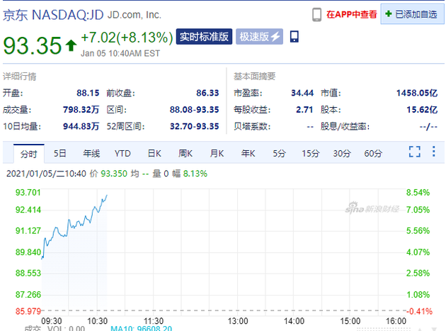 新浪科技讯 1月5日晚间消息,京东涨超8%,股价续刷历史新高,报93.35美元,市值1458亿美元。