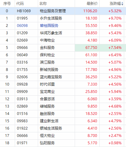 华盛资讯1月6日讯,物管股高开高走,截至发稿,永升生活服务和碧桂园服务均涨超9%,金科服务涨超7%,华润万象服务和保利物业涨超6%。