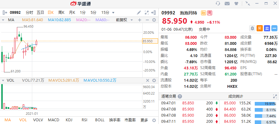 华盛资讯1月6日讯,次新股泡泡玛特(09992)早盘大幅高开,股价一度涨超6%。截至发稿,泡泡玛特大涨6.11%,现报85.95港元每股,当前成交额6566万港元,当前总市值为1205亿港元。